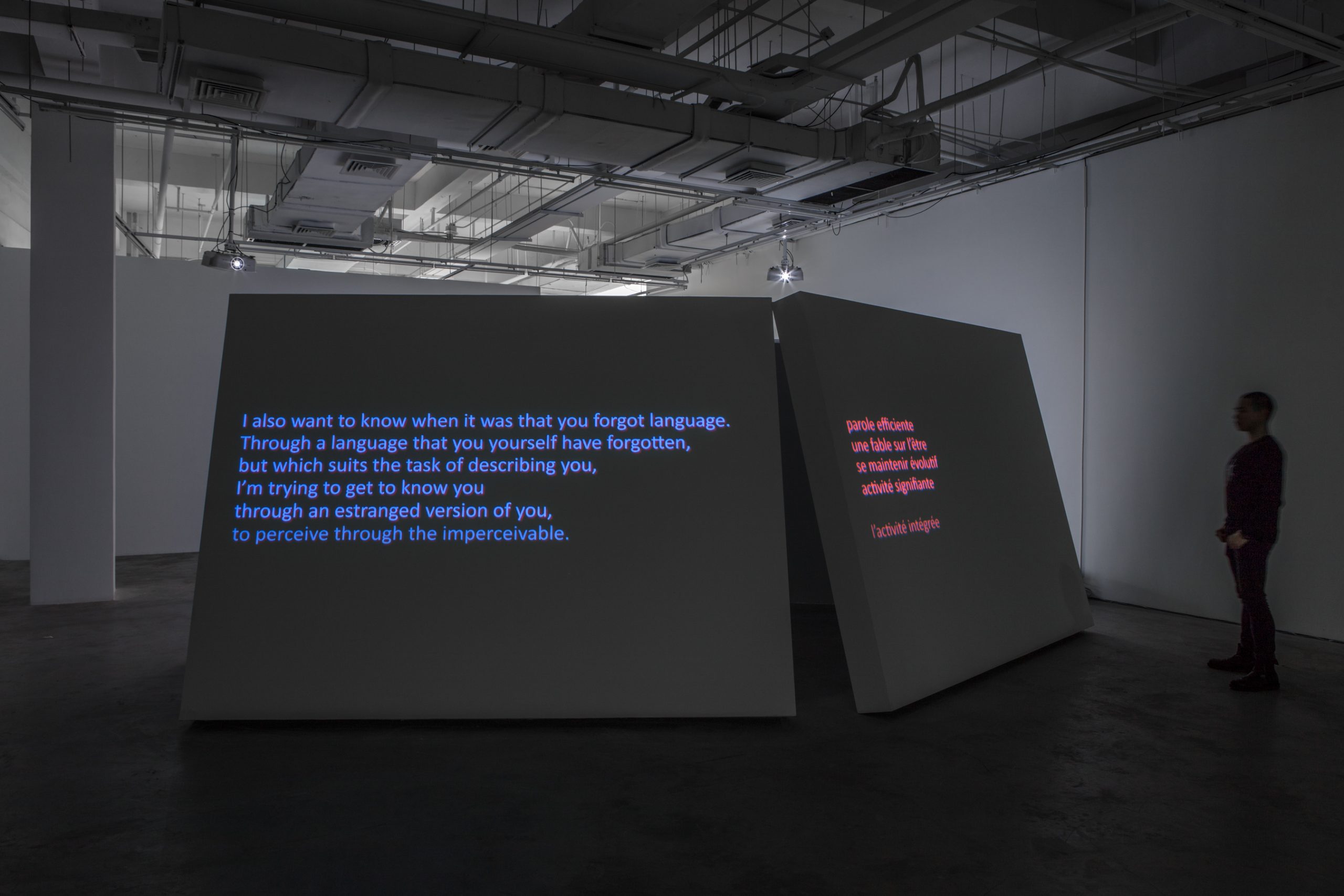 Commerce des Esprits is a four channel video installation presenting a scripted monologue through animation and text. Based on the research of works by French sinologists on Zhuangzi (370 BC-287 BC), Shen Xin translates the perspectives and productivities of comparative philosophy into an event which narrates an unconscious state. The narrative initiates an imagined experiment of autonomous driving, where questions of ethics in technology, safety and death are provoked. Two animation channels traces human bodies through motion capture, while the two text channels reveal in English and French the commerce of language, and its potential for new ways of producing meaning, and for undermining cultural autonomy of the nation state.